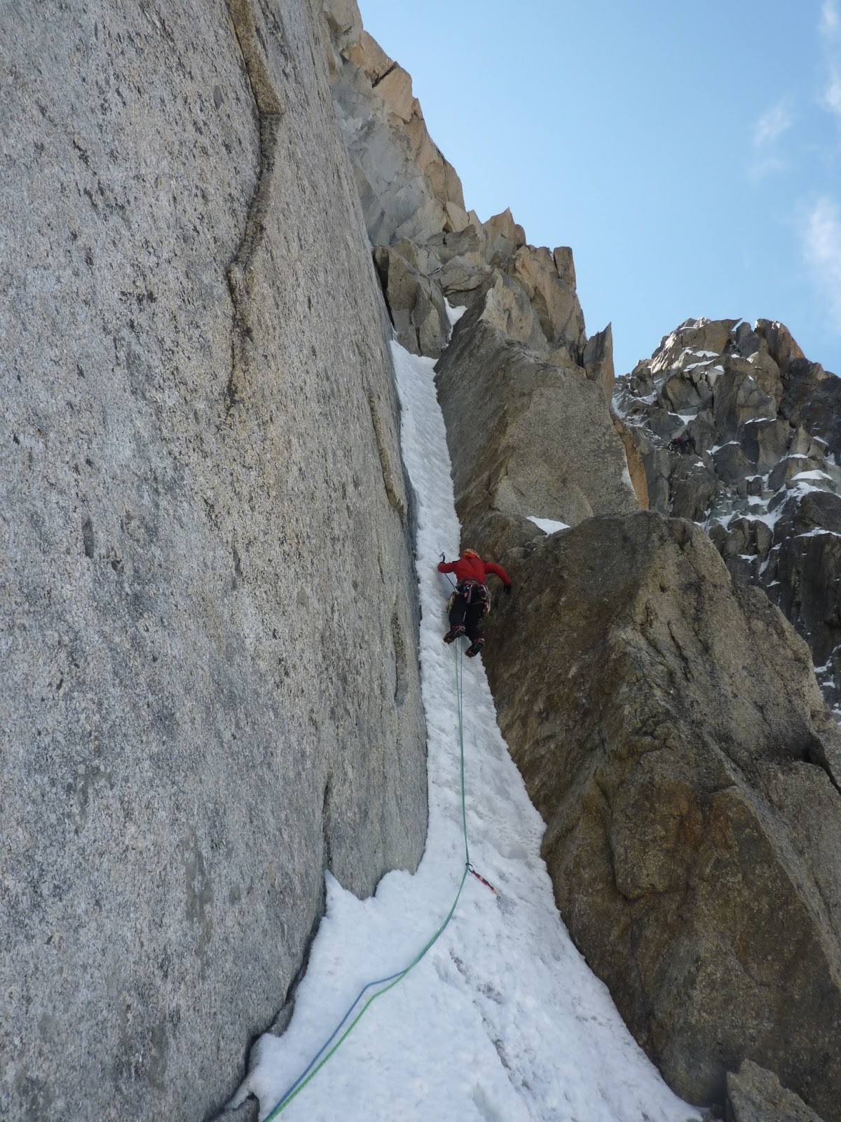 Comenzamos la vía rapelando desde la pasarela de la Aiguille de Midi. El primer largo es común con la Perroux.